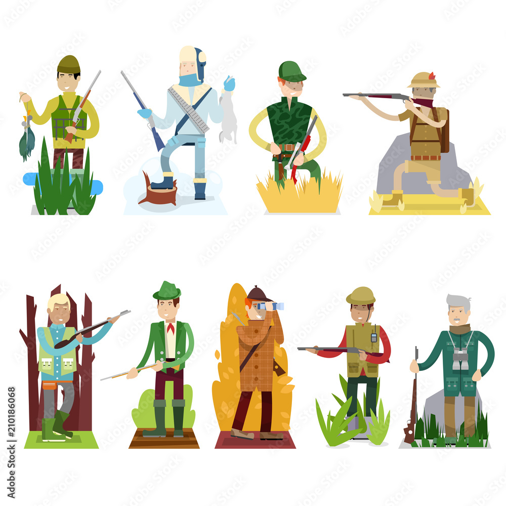 Hunter Vector Set Hunting Gun In Forest Cartoon Character In Hat Hunt With Rifle Or Shotgun Illustration Isolated On White Background Stock Vector Adobe Stock