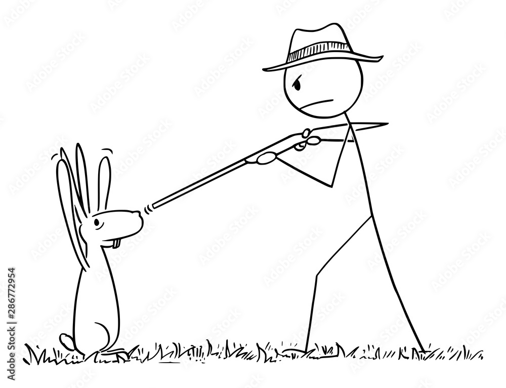 Vector Cartoon Stick Figure Drawing Conceptual Illustration Of Man With Rifle Or Hunter Pointing His Gun At Rabbit Or Hare Or Jackrabbit Animal Surrendered With Paws Or Hands Up Stock Vector
